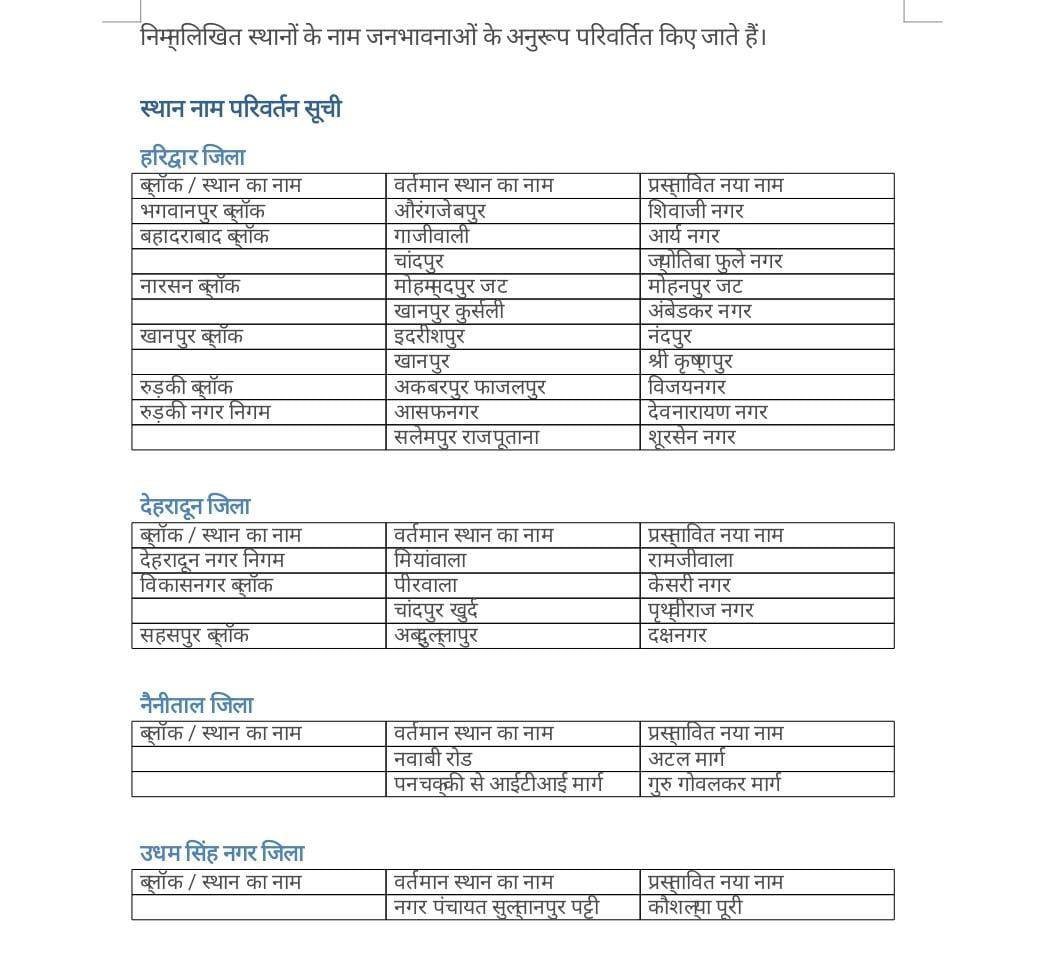 मुख्यमंत्री की घोषणा के अनुसार हरिद्वार जनपद के औरंगजेबपुर का नया नाम अब शिवाजी नगर होगा , गाजीवाली का नाम आर्यनगर, चांदपुर का नाम ज्योतिबा फुले नगर, मोहम्मदपुर जट का नाम मोहनपुर जट, खानपुर कुर्सली का नाम अंबेडकर नगर, इंदरीशपुर का नाम नंदपुर, खानपुर का नया नाम श्री कृष्णपुर, अकबरपुर फाजलपुर का नाम विजयनगर होगा ।