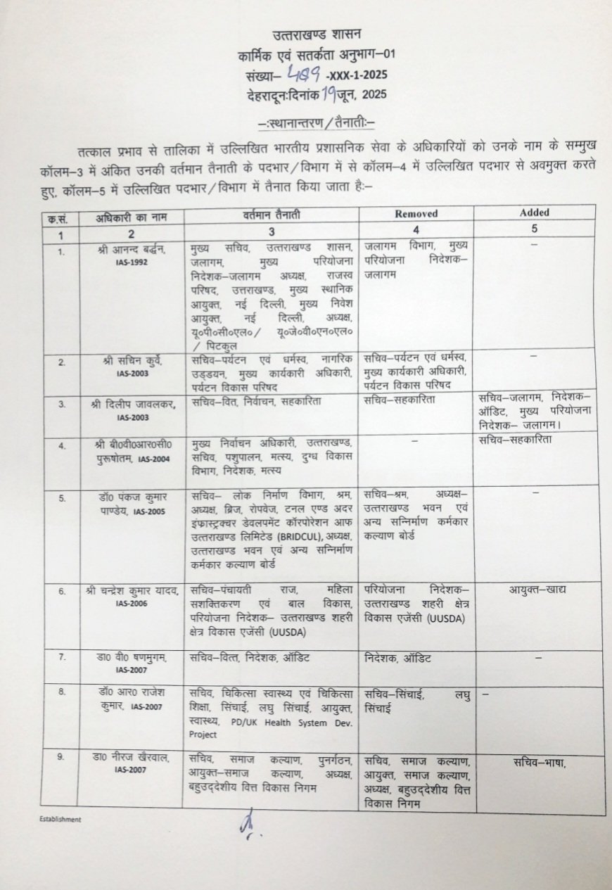 उत्तराखंड में बड़े पैमाने पर प्रशासनिक फेरबदल 33 आईएएस अधिकारी और 24 PCS अधिकारियों के उत्तराखंड में बंपर किए गए तबादले।