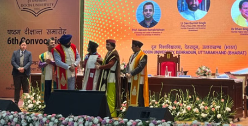 दून विश्वविद्यालय में आज छठे दीक्षांत समारोह का आयोजन हुआ। इस दौरान राज्यपाल ले.ज. गुरमीत सिंह ने वर्ष 2024 के स्नातक 484, स्नातकोत्तर 241 और पीएचडी के 13 विद्यार्थियों को उपाधियां प्रदान की।
